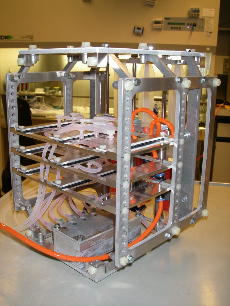 The finding on reduced proliferation on the RPM is in agreement with previous studies. The finding on unchanged differentiation disagrees with a previous study carried out with rat myoblast differentiating on the RPM. Myoblasts were found to have differentiation significantly disturbed. In two other studies mouse myoblasts were exposed to two-dimensional clinostat rotation. Clinostat also simulates microgravity, but rotate around one horizontal axis. At first differentiation appeared to be reduced, but was non-significantly reduced after the hardware was changed to cause less shear stress. However, the results among all of the studies are not directly comparable due to differences in biological models, hardware and differentiation measuring method. Observations during this project suggest that shear stress caused through entrapped air bubbles disturb differentiation.